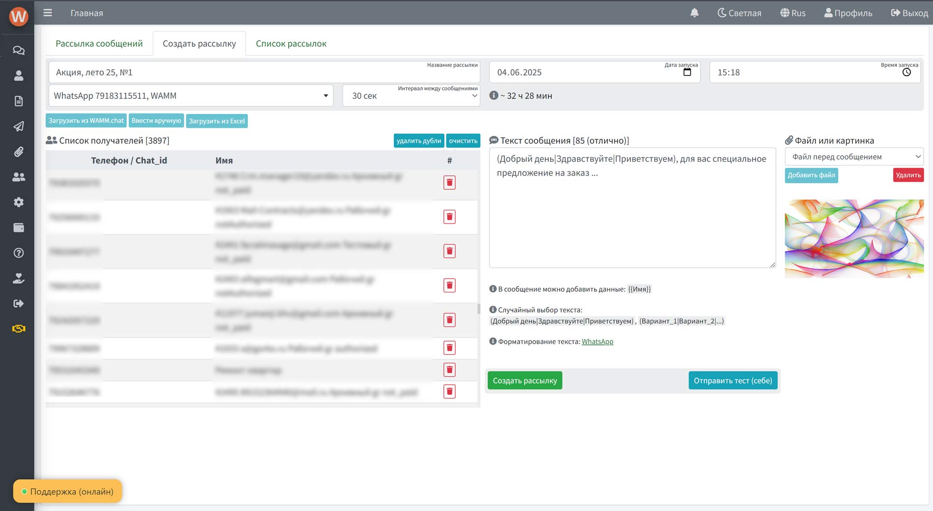 Используйте номера из Excel-таблиц, загружайте списки вручную или импортируйте из контактов. Номера перед отправкой проверяются на наличие мессенджеров