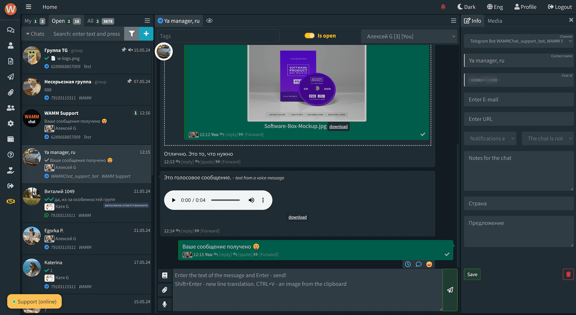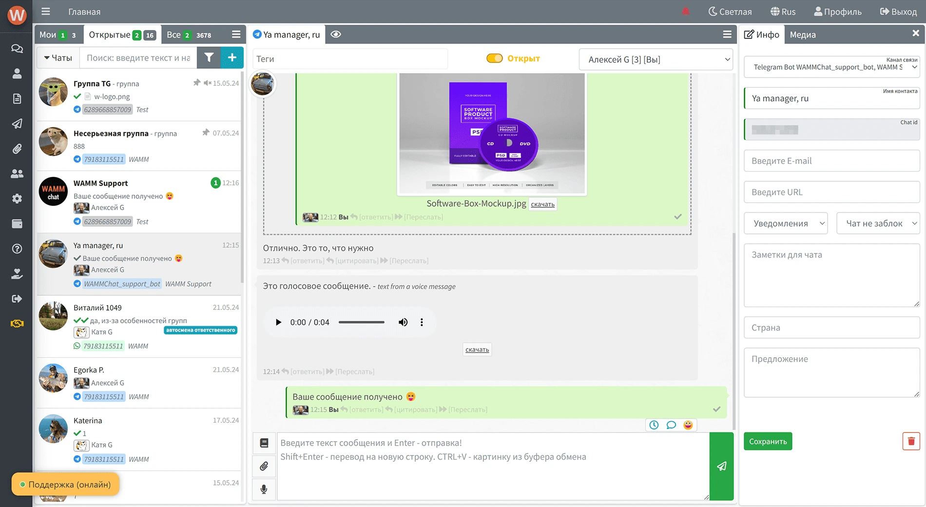 Назначайте ответственных, добавляйте теги и заметки, фильтруйте чаты, ограничивайте доступ к чатам и контактам, переводите голосовые сообщения в текст